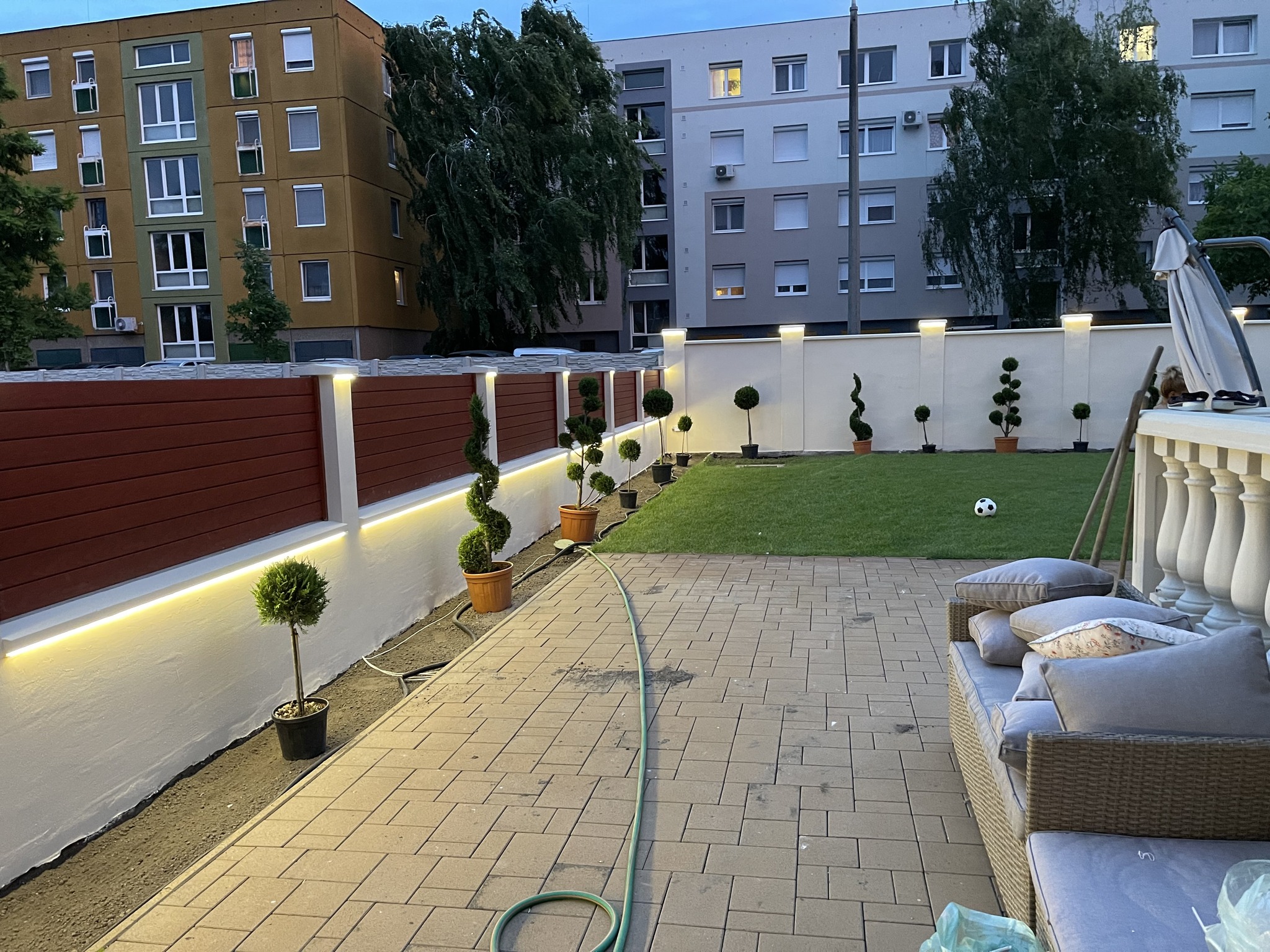 A kert és a kerítés teljes hosszában LED világítás került kiépítésre, amely nemcsak a modern, esztétikus megjelenést, hanem a környezet hangulatát is emeli.